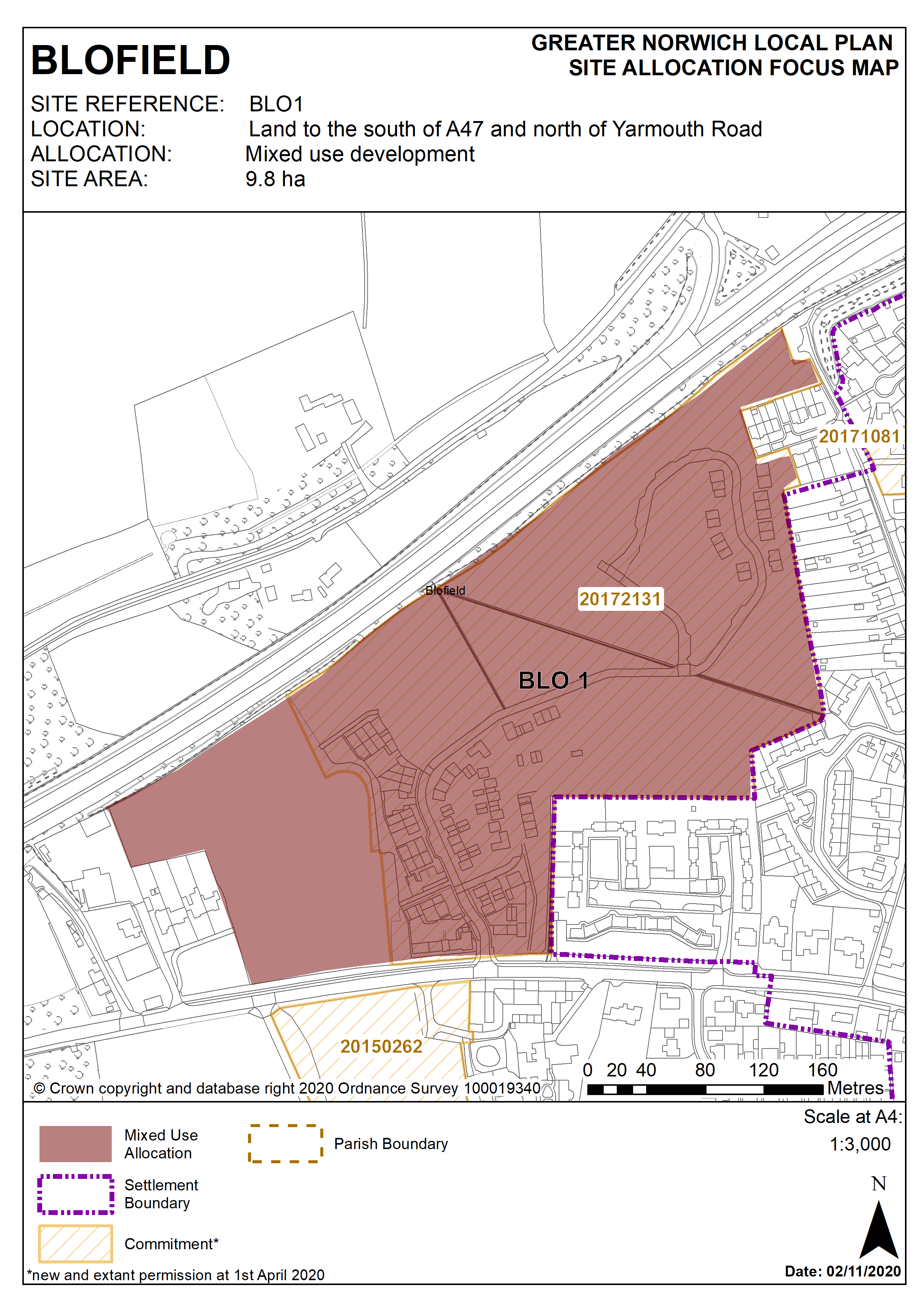 Land to the south of A47 and north of Yarmouth Road, Blofield (approx. 9.8 ha) is to be developed in accordance with planning permissions 20140758  and 20160488. This will include a mixed- use development to deliver 175 dwellings, a maximum floor space of 4,000 sqm E(g) use class and open space.